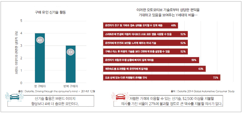 최근 시장 조사에 따르면 자동차 구매 유인이 지난 몇 년 동안 크게 늘었는데, 이것은 신기술에 대한 고객의 관심이 증가했다는 것을 나타낸다. 이러한 기술들에는 운전석의 ‘접속 라이프스타일’과 대시보드를 맞춤 지정할 수 있는 기능, 안전성과 보안성을 늘린 주행 체험 등이 해당된다(그림 2).