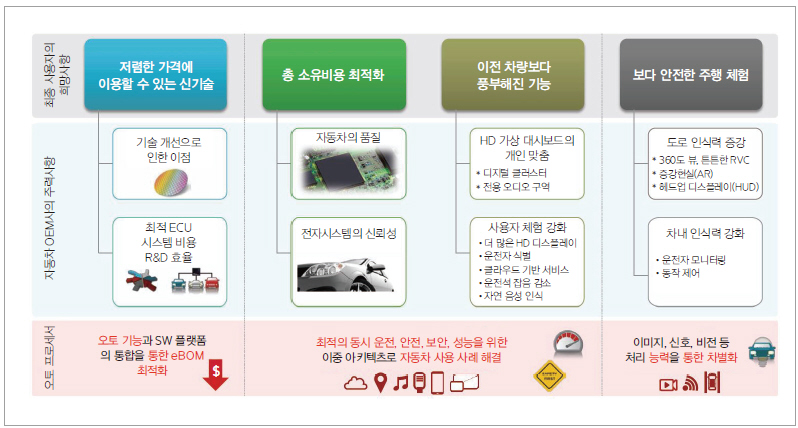 오토모티브 프로세서는 보다 스마트하고 안전하며 커넥티드 카의 기본 요소가 되었다. 다음 페이지 그림 4에 나와 있듯이, 새로운 자동차에서 고객이 가장 중요하게 생각하는 기능을 지원하는 OEM사의 능력과 오토모티브 프로세서의 성능을 직접 연결해 준다.