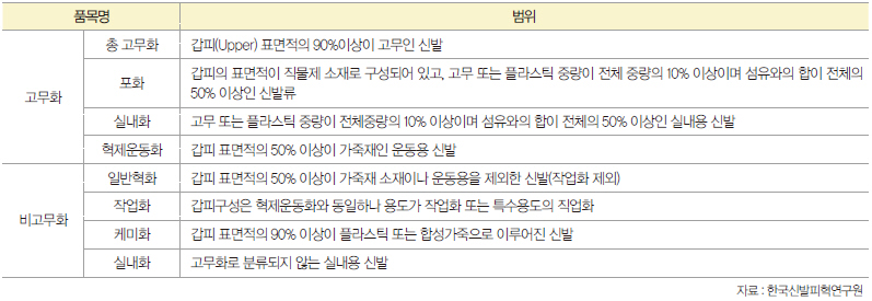 신발 산업은 운동화, 실내화, 구두, 특수 기능성 신발 등을 제조하는 산업으로 전통적인 노동집약적 산업이다. 신발 산업은 갑피, 밑창, 중창, 안창 등의 부품을 조립하여 완제품을 만들기 때문에 부분품의 제조도 신발 산업에 포함되며1), 피혁원단류, 원단류, 고무류, 플라스틱류 등 연관 산업도 존재한다2). 신발산업은 고무화와 비고무화로 분류되며, 최근에는 소재에 따른 분류보다는 워킹화, 런닝화, 구기용 신발 등 용도에 따른 구분이 소비자에게는 보편적으로 받아들여지고 있다.