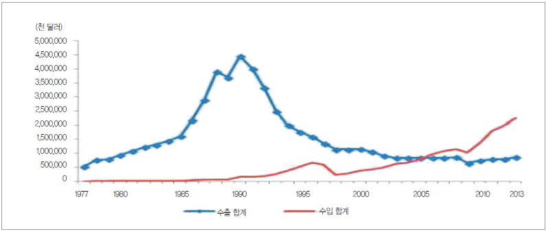 ▲ 그림 1. 신발산업의 수출ㆍ입 추이 (자료 : 권오혁(2014))