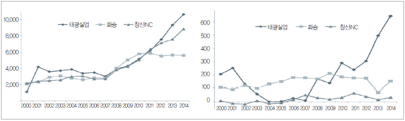 ▲ 그림 2. 연도별 주요 기업의 매출액(좌) 및 영업이익(우) (출처 : 각사 사업보고서)
