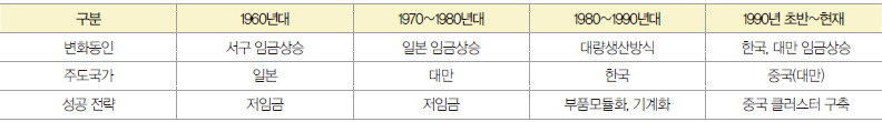 신발 산업은 1960년대 서구의 임금 상승으로 상대적으로 인건비가 저렴한 일본이 산업의 주도권을 확보하였다가, 1970년대에는 일본의 임금 상승으로 대만 등으로 산업의 주도권이 이동하였으며, 1980년대에는 부품화ㆍ기계화 추세로 우리나라가 그 주도권을 확보하였다. 산업의 주도권이 국내로 이전되면서 우리 신발 산업은 1990년 국내 수출비중의 6.6%를 차지할 정도로 주요 수출산업으로 자리잡아 일자리 창출과 경제성장에 역할을 했다.