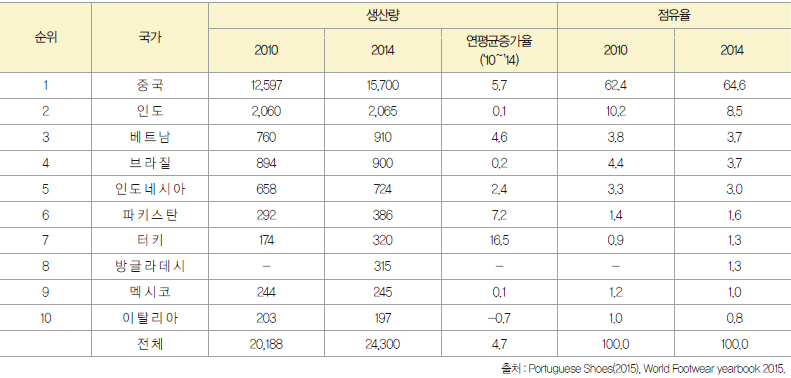 세계 신발 총생산량은 2014년 약 243억 켤레로, 2004년부터 10년간 연평균성장률 5.0%를 기록했다. 아시아 대륙에서 88%의 신발이 생산되고 있으며, 중국이 세계 신발 생산량의 2/3 수준(64.6%)을 생산하며 세계 신발 생산량의 1위를 차지하고, 그 뒤로 인도와 베트남이 각각 8.5%, 3.7% 생산하고 있다. 신발생산 세계 상위 10개국 중 비아시아 국가로는 브라질이 생산량 9억 족을 기록하며 4위에 위치하고 있다.