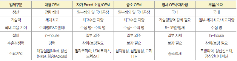 이 외에도 영세OEM과 부품소재 기업이 있으며, 조광피혁, 성신신소재 등으로 대표되는 부품소재 기업의 경우 경쟁상대국에 비해 높은 기술력을 보유하고 있으며, 국내에서 생산하는 것이 특징이다. OEM기업이 대부분인 국내 신발 산업은 글로벌 브랜드 기업들의 국내 OEM 생산을 통한 수출이 생산기지 해외 이전으로 인해 크게 감소하였다. 이를 종합하면 아래 표 6과 같다.