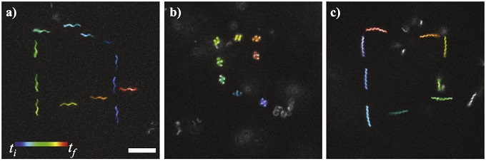 ▲ 편모 나노로봇의 운동 상태로, a)는 일반적인 궤적, b)는 감겨지는 궤적, c)는 지그재그로 수영하는 궤적이다. 한 궤적의 크기는 5미크론(μm)이다.