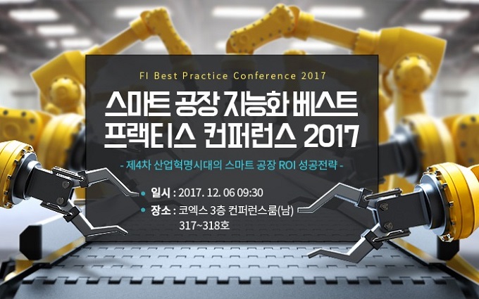 스마트 공장 지능화 베스트 프랙티스 컨퍼런스 2017(Smart Factory Intelligence Best Practice Conference 2017, FI 2017)이 제4차 산업혁명시대의 스마트 공장 ROI 성공전략을 주제로 오는 12월6일 서울 삼성동 코엑스 컨퍼런스룸 317, 318호에서 개최된다.