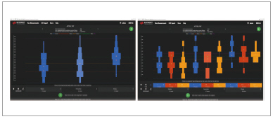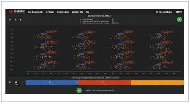 스윕 플롯 또는 벡터 플롯은 2 차원 "스윕 데이터(sweep data)"를 볼 수 있게 해준다. D2M 및 테스트 및 측정 애플리케이션은 시간-영역 파형, 주파수-영역 크기 플롯 및 아이 다이어그램과 같은 스윕 데이터에 크게 의존한다. 올바른 분석 툴은 예를 들어 팀이 서로 다른 테스트 조건에서 여러 개의 아이 다이어그램을 겹치게 할 수 있다. 오버레이 기능은 눈 모양이 작아지거나 마진이 적은 테스트 조건을 결정할 수 있게 해준다. 설계 엔지니어는 이 정보를 사용하여 최상의 성능을 위해 설계를 최적화할 수 있다. 스윕/벡터 플롯의 또 다른 예는 배열 다이어그램이다. 그림 1은 5G QAM4 배열 다이어그램의 예를 보여준다. 3 개의 서로 다른 입력 전압 즉, 1V, 0.9V 및 0.8V를 나타내는 3 세트의 배열 데이터 오버레이가 있다. 플롯은 입력 전압이 1V인 배열 다이어그램이 가장 깨끗한 전송 기호를 가지고 있음을 보여준다. 입력 전압이 0.8V인 배열 다이어그램은 잠재적인 위상 잡음 문제가 있는 가장 낮은 수신 신호 품질을 가진 것으로 보인다.
