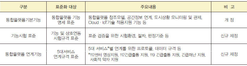 표준화 대상은 통합 플랫폼 기본 기능과 관련된 기능 명세 표준, 서비스 등 연계를 위한 연계 규격 표준, 인증시험을 위한 시험규격 표준 등 3개 표준으로 11월부터 전문인증기관인 한국정보통신기술협회(TTA)에서 인증이 실시되고 있다.