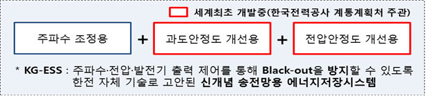 KG-ESS는 전력계통의 안정도를 개선하는 계통안정화용 ESS를 의미하며, 계통주파수 조정을 위해 기 설치된 ESS를 포함해 지금 한전에서 세계 최초로 개발 중이며 전압안정도 개선용 ESS를 총칭해서 말한다.