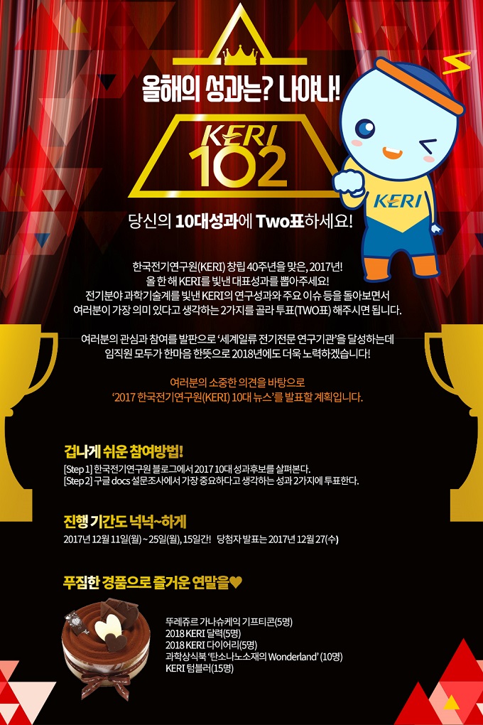 방법은 한국전기연구원(이하 KERI) 홈페이지 및 SNS 페이지(페이스북, 블로그, 인스타그램) 등을 통해 후보성과 설명을 보고 가장 의미 있다고 생각하는 2가지(Two)를 골라 투표하면 된다. 당첨자 발표는 27일(수)에 진행되며, 투표자 중 추첨을 통해 총 40명에게 연말연시용 케이크, 텀블러, 2018년도 고급 다이어리 등의 경품을 증정한다.