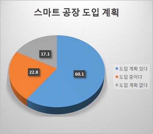 같은 질문에 ‘계획을 갖고 있다’고 응답한 조사 대상자는 60.1%로 나타났다. 응답자의 절반 이상이 현재 근무하고 있는 업체에서 스마트공장을 구축하기 위해 다양한 형태로 추진 중인 것으로 나타났다. ‘계획이 없다’고 답한 조사 대상자도 17.1%에 달했다.
