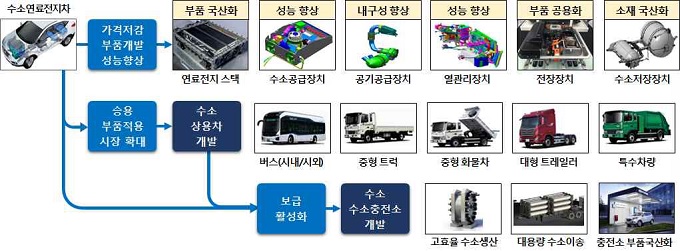 아울러 전기·수소차 시장 확대와 중소·중견 부품기업의 기술력 확보를 위해 핵심기술에 대한 R&D도 지속 추진하고 있다. 전기차 주행거리의 획기적인 개선을 위해 배터리의 에너지밀도를 2배 이상 향상하는 ‘고밀도 이차전지 개발 프로젝트’가 진행 중이며, 2019년 출시를 목표로 1회 충전 주행거리 250km 이상의 1톤 전기화물차가 개발되고 있다. 2018년 평창올림픽 경기장과 울산에서 수소버스가 시범운행 될 예정이고, 수소차의 가격 저감을 위해 핵심부품에 대한 기술개발도 진행하고 있다.