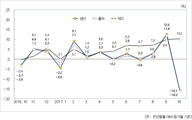 10월 기계산업 재고는 금속제품을 제외한 모든 업종에서 증가하여 전년동월 대비 10.2% 증가했다. 일반기계는 정수기, 수송기계는 중형트럭, 전기기계는 전자레인지, 정밀기계는 의료용방사선기기 중심으로 증가, 금속제품은 금속 패널제품 중심으로 감소했다.