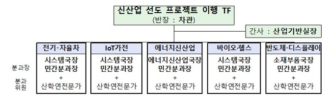 특별전담팀은 5대 신산업 선도프로젝트의 이행을 총괄하기 위한 조직으로, 산업부 차관을 반장으로 5개 분과로 구성하고, 분과는 분과장(담당국장 및 민간위원장)과 산·학·연 민간전문가 10여명으로 구성했다.