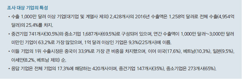 업종별로는 농수산물 수출기업의 경우 중소·중견기업의 글로벌 기업에 대한 M&A 활성화 및 파트너십 확보를 중요하게 생각했으며, 석유제품, 가전 수출기업은 내수기업의 수출기업화를 통한 중소·중견기업의 저변 확충도 필요한 것으로 응답했다.