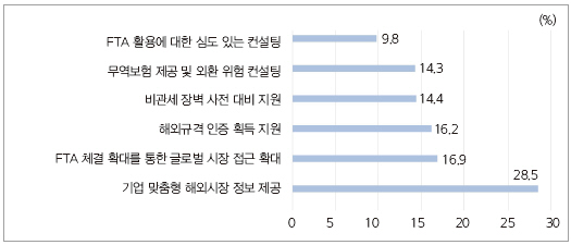 수출 비중별로 보면, 수출비중이 10% 미만인 기업들은 해외규격인증 획득 지원을 가장 필요로 했으며, 나머지 기업들은 기업 맞춤형 해외시장정보 제공에 대한 수요가 가장 높게 나타났다.