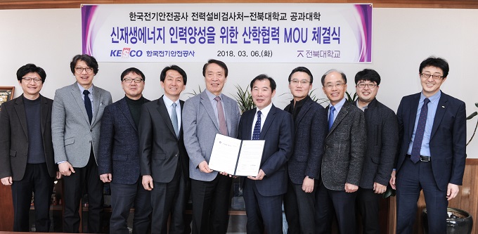 한국전기안전공사(사장 조성완)가 신재생에너지 산업의 발전과 기술 인력 양성을 위해 지역 대학과 손을 맞잡았다. 공사는 지난 6일(화) 전북대학교 공과대학에서 김성수 부사장과 김철생 공과대학장이 함께 한 가운데 ‘신재생에너지 분야 인재 육성을 위한 업무협약’을 체결했다.