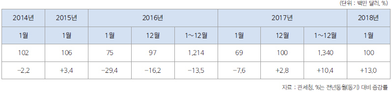 수출도 전년동월 대비 43.2% 증가한 1억7,900만 달러로 지난 10년 간 가장 높은 수출액을 기록했다. 다만 전월과 비교하면 10.9% 감소했다. 생산은 전년동월 대비 25.7% 감소한 1,435억원을 기록했다.
