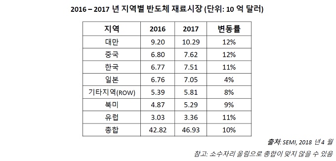 대형 파운드리와 첨단 패키징을 기반으로 한 대만은 8년 연속 반도체 재료분야에서 가장 큰 소비국으로 자리잡고 있으며, 2017년 103억 달러를 기록했다. 중국이 그 뒤를 이어 76억 달러로 2위, 한국이 75억 달러로 3위를 차지하고 있다. 대만, 중국, 한국, 유럽 시장은 지난해 대비 매출 폭이 큰 반면, 일본, 북미지역과 기타지역(싱가포르, 말레이시아, 필리핀, 기타 동남아시아 지역, 소규모 기타 지역 포함) 재료시장은 한자리 수의 증가율을 보였다.