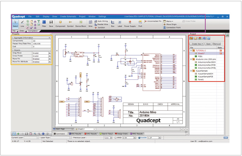 아래 화면은 쿼드셉트의 회로도 화면이다. 화면 구성은 크게 네 영역으로 나뉘는데, 실제 설계를 하는 설계화면과 분홍색으로 표시된 메뉴 화면, 노란색으로 표시된 속성화면, 마지막으로 빨간색으로 표시된 프로젝트 관리화면으로 나눌 수 있다. 이 화면 구성은 라이브러리 작업 화면이나 PCB 설계 화면 모두 동일하다.