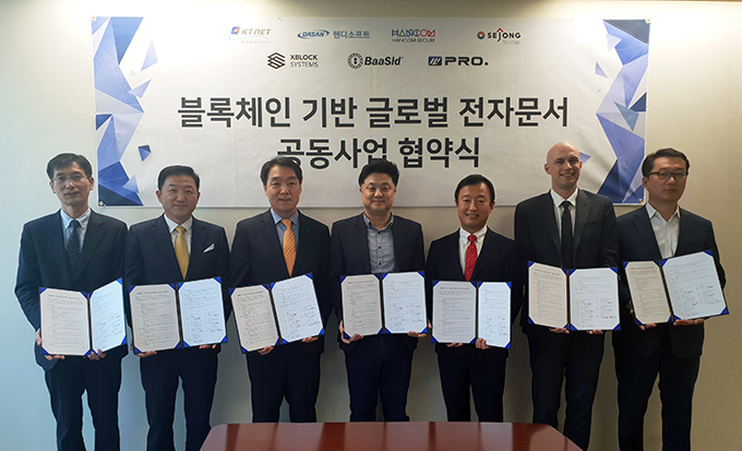블록체인기술 기반의 전자문서, 보안, 통신 등 관련업체들이 글로벌진출을 위한 전자문서 공동사업을 위한 컨소시엄 구성하고, 공동사업 협약을 지난 5월4일 체결했다.