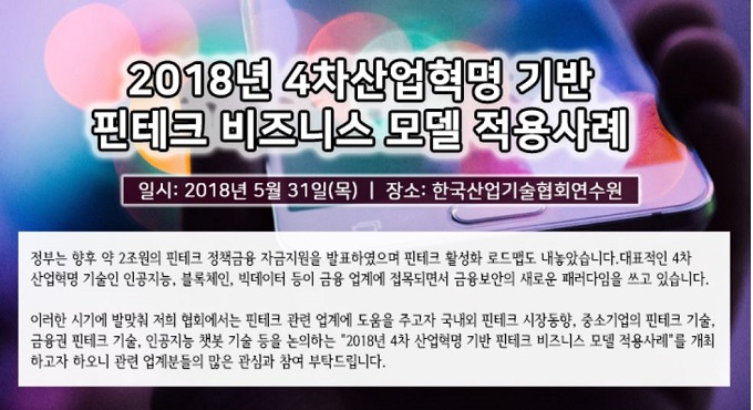 이러한 시기에 발맞춰 한국산업기술협회가 오는 31일 서울 가산동에 위치한 협회연수원에서 '2018년 4차 산업혁명 기반 핀테크 비즈니스 모델 적용사례'를 주제로 세미나를 개최한다.