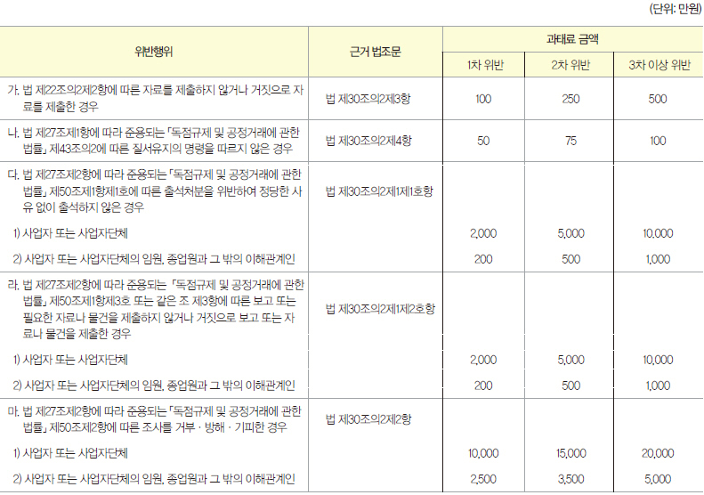 공정위는 이번 시행령 개정을 통해 과태료를 부과함에 있어 고려하는 요소를 공정위 소관 다른 법령의 입법례를 참고하여 합리적으로 개선하고,일부 미비된 과태료의 부과 기준을 시행령에 구체적으로 설정함으로써, 수범자의 예측 가능성이 높아지고 법 체계의 통일성이 제고될 것으로 기대하고 있다.