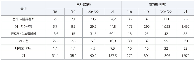 ▲ 표1. 신산업 분야별 향후 5년간 투자·일자리