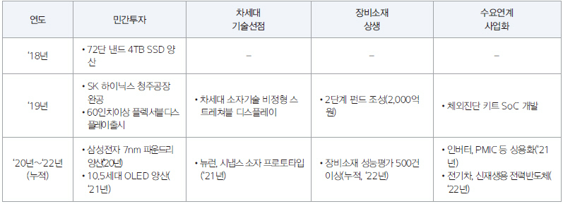 반도체·디스플레이 분야는 후발국의 빠른 추격에서 벗어나 초격차를 유지하기 위해 60조 원에 이르는 민간의 대규모 투자를 바탕으로 차세대 기술선점, 장비-소재 상생협력, 수요연계 사업화 등 체계적인 전략을 추진한다.
