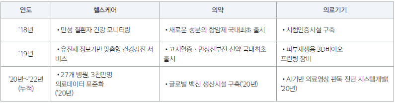 바이오·헬스 분야에서는 저출산·고령화로 대표되는 인구구조 변화에 선제적으로 대응하기 위해 방대한 의료 정보와 정보통신기술(ICT)력을 활용해 의료 빅데이터를 구축(복지부 협업)하고, 이를 활용한 헬스케어·신약 등 분야에서 국제 경쟁력을 확보하기로 했다.