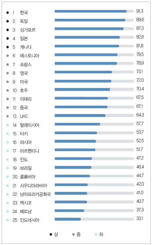 각 지수 카테고리별로 선진국이 우위를 차지하고 있는데 이는 해당 국가의 정책 환경이 지능형 자동화로 인한 도전 과제와 기회를 가장 잘 살리고 있음을 의미한다. 세 카테고리 모두에서 높은 점수를 받은 한국이 1위를 차지했다.