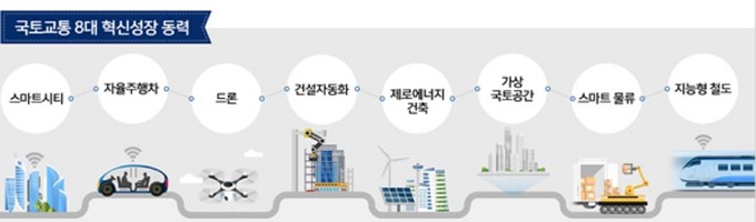 특히 ‘국토교통 8대 혁신 성장 동력’으로 스마트시티, 자율주행차, 드론(무인기), 건설자동화, 제로에너지건축, 가상국토공간, 스마트물류, 지능형철도를 선정해 차세대 프로젝트로 집중 지원할 계획이다.