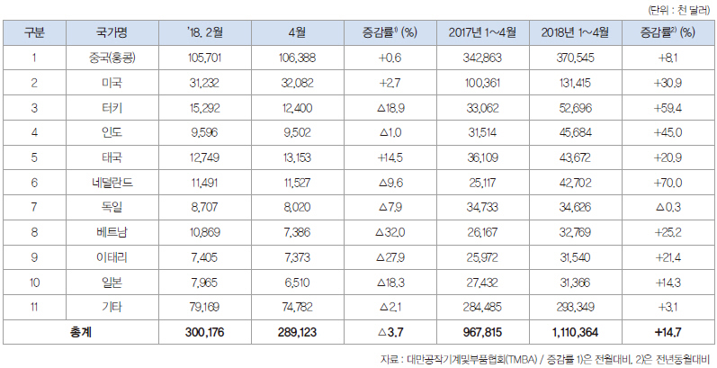 ▲ 2018년 4월 대만의 국가별 공작기계 수출 현황