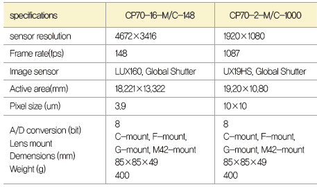 초고속 어플리케이션 측정에 적합한 CP70-2-M/C-1000 카메라는 1000fps 이상의 Full HD 해상도를 제공합니다.