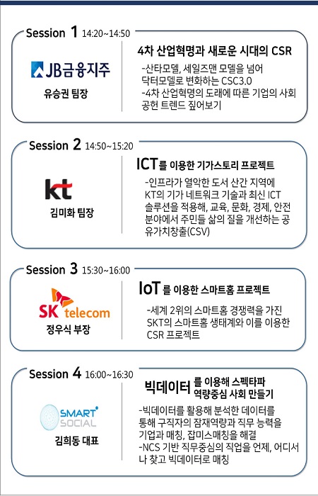 이번 컨퍼런스에는 유승권 JB금융지주 팀장의 ’4차 산업혁명과 기업사회공헌-산타, 세일즈맨, 닥터’의 주제 발표를 시작으로 정우식 SKT 부장은 ‘스마트홈 생태계와 CSR’의 주제로 발표한다. 이어서 김미화 KT 팀장은 ‘ICT기술을 활용한 KT 기가스토리 프로젝트’,  김희동 스마트소셜 대표는 ‘빅데이터를 활용한 지역 청년과 중소기업의 잡미스매치 문제 해결을 위한 우리의 도전’이라는 주제로 발표한다.