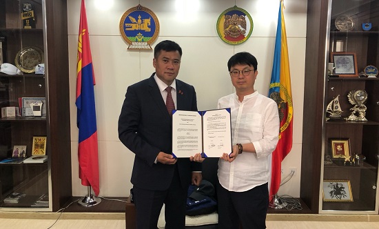 ▲지난 6월 26일, 한·몽 신재생에너지 협력 현장에서 (왼쪽)몽골 울란바토르시 수흐바타르구의회 간바트 의장과 KTL 환경융합기술센터 박찬규 책임연구원이 기념촬영을 하고 있다.
