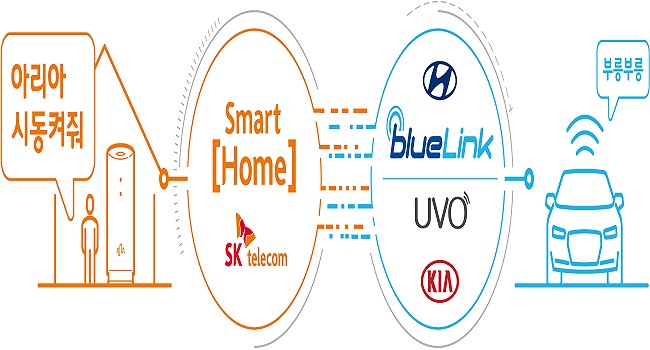 SK텔레콤이 현대차 블루링크ㆍ기아차 UVO와 연동되는 차량 제어 서비스 ‘Home2Car’를 24일 시작한다.
