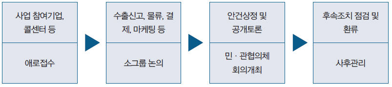 이와 같이 다품종·소량 상품을 취급하는 B2C 전자상거래특성상 규모의 경제를 달성하기 어려운 중소기업들은 가격경쟁력 확보가 어려워 대책 마련이 필요하다는 건의에 대하여, 중기부는 흩어져 있는 중소기업의 온라인 수출 물류를 집적하여 비용을 낮추는 방안을 검토하고, 금년 하반기 시범사업을 거쳐 ‘19년부터 본사업을 추진하겠다는 계획을 제시했다.
