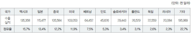 對멕시코 수출 첫 1위 등극… 멕시코·일본·중국·미국 1억 달러 넘어