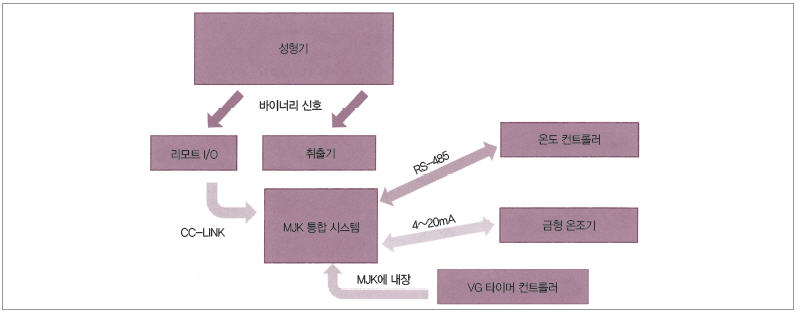 MJK 통합 시스템의 전체 구성은 그림 1과 같이 된다. 성형기를 기점으로 해, 조건 번호를 이 시스템으로 전달함으로써 주변기기에 필요한 설정값을 전달한다.