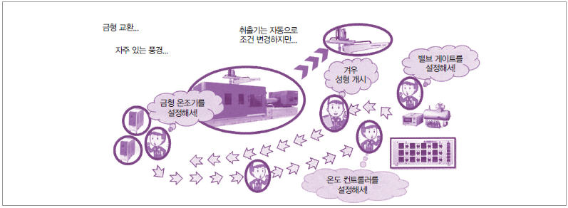 그림 3은 작업자가 성형기 주위를 돌도록 각 주변기기의 설정 작업을 순차적으로 해 가는 일상적으로 자주 볼 수 있는 금형 교환의 풍경이다. 그러나 작업 시간이 10~30분으로 의외로 수고스러운 공정이다. 이 시스템을 도입함으로써 그림 4와 같이 작업자가 움직이지 않고 성형기 주변기기의 조건 변경 시간을 단축함으로써 금형 교환에서 생산 개시까지의 시간에 차이가 생긴다. 이 차이는 적어도 10분 이상인 경우가 많고, 다양한 세팅 개선이 실시되고 있는 성형 현장에서는 그만큼의 시간 단축을 할 수 있는 것은 획기적이다.