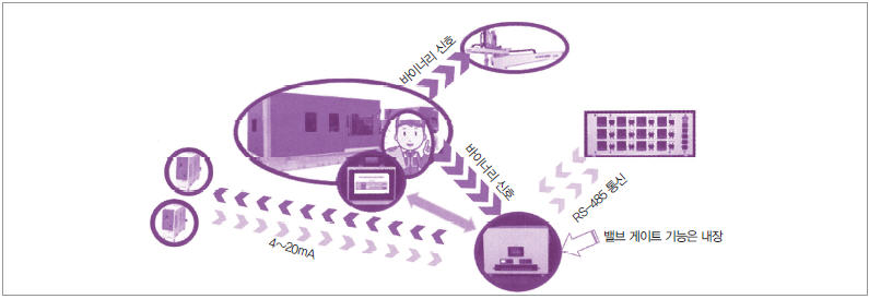 성형기로부터 조건이 변경된 것을 이 시스템측에 전달하는 신호는 선정할 때에는 수많이 있는 방식 중에서 취출기와의 연동에 바이너리 신호가 사용되고 있는 점에 착안했다. 바이너리(binary)란 이진법을 가리키며, 일반적으로는 컴퓨터가 처리·기억하기 위해 이진화된 파일 또는 그 내부 표현의 형식(바이너리 데이터)를 가리키고 이용하는 경우가 많다. 전기적으로는 이진수(0과 1)는 ON과 OFF로 치환되고, 그 조합으로 수치를 표현(전달)할 수 있다.