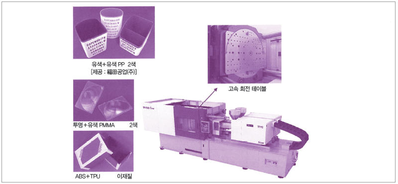 ▲ 그림 1. 2색·이재질 성형기 ‘Si-230-6RW’와 성형품