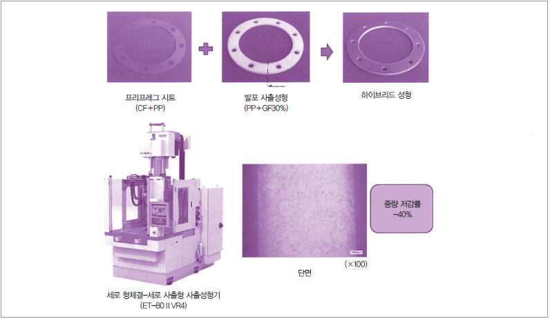 동사에서는 혼합 프로세스를 베이스로 독자의 개념을 더한 물리발포장치를 개발, IPF 2017에 참고 출품했다. 출품 시에는 그림 5에 나타낸 세로 형체결-세로 형사출의 사출성형기를 이용해 경량화 요구에 대한 솔루션을, CFRTP의 프리프레그 시트와 물리발포 성형을 조합시킨 성형 실연을 함으로써 홍보했다. 혼합 프로세스는 범용기를 베이스로 전용 노즐 부품으로 교환하기만 하는 간소한 장치 구성이기 때문에 세로 형성형기를 비롯해 2색 성형기나 서브 사출 유닛에도 용이하게 탑재가 가능하다.