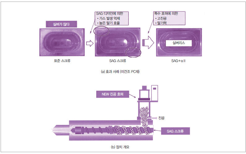 이들 과제에 대해 동사에서는 그림 6에 나타낸 SAG+αⅡ 시스템을 개발해 시판하고 있다. SAG+αⅡ는 가스 발생 억제에 효과를 나타내는 SAG 스크류에 진공 호퍼를 조합시킨 시스템으로, 기존 기술과는 다른 개념의 진공 가스 탈기 시스템이다.