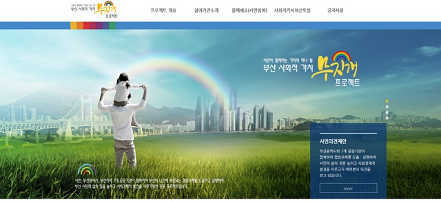 ‘부산 사회적가치 무지개 프로젝트’로 명명된 홈페이지는 부산 지역의 사회적가치 실현을 위하여 7개 공공기관이 모여 부산시민에게 희망을 전한다는 의미를 담고 있다.