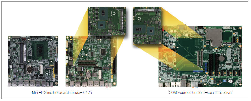 이러한 용도로는 임베디드 x86 하드웨어가 특히 더 적합하다. 표준화가 잘 되어 있고 포괄적인 도큐멘테이션이 제공되기 때문이다. 폼팩터뿐만 아니라 애플리케이션 프로그래밍 인터페이스에 있어서도 표준화가 잘 되어 있다. 따라서 보드가 PICMG의 eAPI 표준이나 SGET의 UIC 표준을 충족하기만 한다면 하드웨어를 손쉽게 교체할 수 있다. 더 나아가서 애플리케이션의 필요에 따라서 마더보드와 ‘컴퓨터 온 모듈(COM)’ 같이 서로 다른 폼팩터 간에도 자유롭게 변경할 수 있다. 콩가텍은 이러한 표준화 및 도큐멘테이션뿐 아니라 하드웨어 통합을 손쉽게 하는 것을 무엇보다 중요시하고 있다.