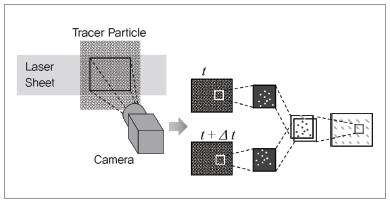 PIV란 입자 화상 유속 측정법(Particle Image Velo-cimetry)의 약자로, 현재는 여러 가지 유체의 흐름 거동을 파악하기 위한 수법으로서 아주 일반적으로 이용되고 있다. PIV에서는 유체 중에 분산된 입자에 대해, 유체의 이동을 추종하고 있는 입자군을 2시간 동안 화상 촬영해 화상 중 일정 영역의 입자군 휘도 패턴 이동량을 해석으로부터 유체의 속도 분포를 조사하는 것이다.
