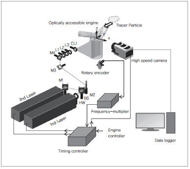 계측에서는 더블 펄스 Nd:YAG 레이저(LOTIS, LS-2131), 고해상도 카메라(Princeton Technology, ES4020)을 엔진 크랭크 각도 신호에 동기시켜 입자 화상을 취득하고 있다. 또한, 레이저 및 카메라 동작 속도의 제약 때문에 앞에서와 같은 1사이클 중의 시계열 연속 측정은 할 수 없으므로 설정한 크랭크 각도에 대해서만 1000사이클 정도의 계측을 하고 있다.
