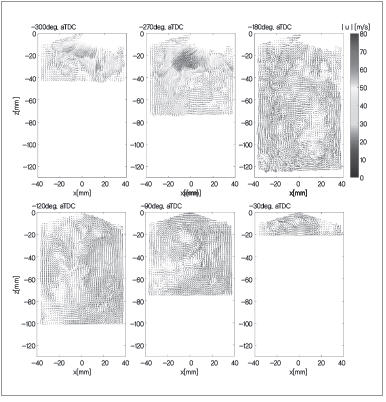 엔진 통내의 유동에 대해서는 최근의 유체 계측 기술의 눈부신 발전에 의해 실제 계측을 기초로 여러 가지 유체특성이 계속 밝혀지고 있다. 그 중에서도 특히 최근 수십 년 사이에는 레이저 등 광학장치의 고출력화, 카메라 등 촬영장치의 고속화·고정세화 및 컴퓨터 화상 해석 기술의 발달에서, 현재 유체 계측의 주류로 되어 있는 PIV 계측이 엔진 통내의 유체 계측에도 적용 가능한 수준이 되어 여러 가지 통내 유동의 특징을 파악할 수 있게 됐다.
